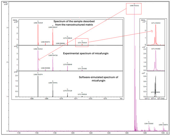 Additional confirmation of the sustained desorption of micafungin from the nanostructured core-shell design was performed through the FT-ICR MS analysis of the sample containing the micafungin that was released after sustained desorption for 2 h or, more exactly, 138 min (Figure 12). The obtained mass spectrum highlights the agreement between the isotopic profile of the prediction that was based on the molecular formula and the micafungin standard of the resulting solution after desorption. An additional check for the ([M + H]+ + 3) peak highlights the similarity of the isotopomer peaks in the isotopic fine structure.