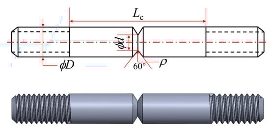 Schematic diagram of notched specimen (ρ = 0.25 mm; ϕd = 3 mm; ϕD = 6 mm; Lc = 25.4 mm).