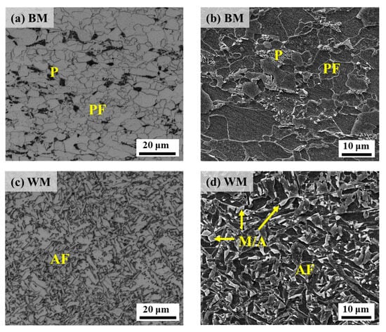 The microstructures of the BM and WM in X70 pipeline steel were analyzed and are shown in Figure 3, in which the BM (Figure 3a,b) consists mainly of polygonal ferrite (PF) + pearlite (P), and the WM (Figure 3c,d) is predominantly acicular ferrite (AF), with a large number of Martensite/austenite (M/A) constituents seen.