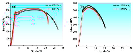 Figure 4a,b show the slow strain rate testing stress-strain curves of X70 pipeline steel BM and WM, respectively. Compared to 10 MPa nitrogen, the UTS of BM in 10 MPa hydrogen shows a minor increase, while EL decreases significantly; the UTS and EL of the WM in the 10 MPa hydrogen environment are lower than that in the 10 MPa nitrogen environment.