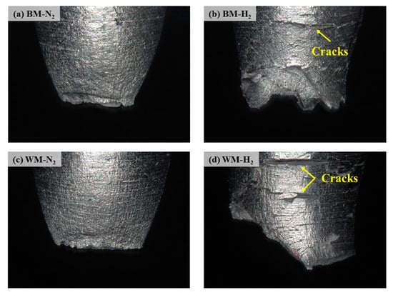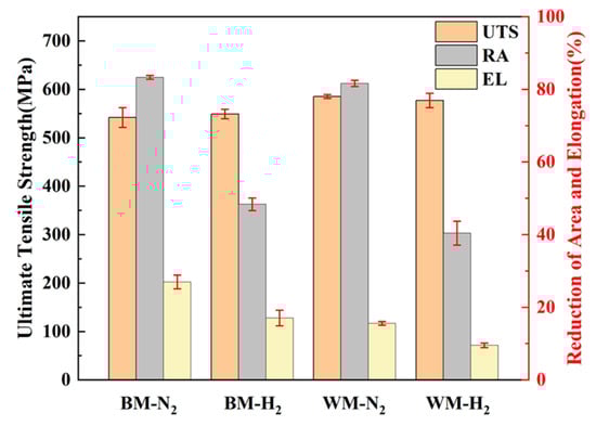 The results of the slow tensile comparison of BM and WM under nitrogen and hydrogen environments are given in Figure 5. It can be seen that the UTS of BM and WM under nitrogen and hydrogen environments do not change greatly. The results of related research show that the gas environment does not have a significant effect on the strength of specimens. Among them, the RA and EL of BM and WM in the hydrogen environment are much lower than that in the nitrogen environment as a whole, and the comparison can be seen that the loss rate of UTS and EL of BM in a high-pressure hydrogen environment is not much different from that of WM, whereas the degree of RA of WM is very significant. The specific slow strain rate testing data are given in Table 2, and the loss rates of UTS, RA, and EL of the BM specimens are −1.3%, 41.9%, and 37.0%, respectively; the loss rates of UTS, RA, and EL of the WM specimens are 1.4%, 50.5%, and 39.1%, respectively.