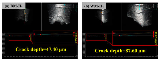 The macroscopic morphology of the fracture side of the BM and WM under 10 MPa nitrogen and 10 MPa hydrogen was observed by using an ultra-depth microscope. As shown in Figure 6, the BM and WM showed clear necking, with fracture surfaces that were relatively flat under nitrogen conditions (Figure 6a,c); the fracture surfaces of the BM and WM were uneven and jagged under hydrogen (Figure 6b,d), and obvious annular cracks were observed on the fracture sides, which were typical hydrogen induced cracks. The maximum value of the crack depth was taken after measuring the depth of the annular crack, as shown in Figure 7, the maximum crack depth of the BM specimen was 47.40 μm, and the maximum crack depth of the WM specimen was 87.60 μm.
