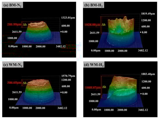 Figure 8 gives the 3D diagrams of the fracture (fracture’s color from highest to lowest: orange, green, blue) of BM and WM specimens under 10 MPa nitrogen and 10 MPa hydrogen environments. Overall, it can be seen that the hydrogen environment increases the fracture surface unevenness significantly compared to the nitrogen environment. Measurement of the fracture unevenness (Δh) of the specimens revealed that compared with the nitrogen environment (281.99 μm), the fracture unevenness of the BM specimens in the hydrogen environment increased significantly (1028.00 μm); the fracture unevenness of the WM specimen in the nitrogen environment was 306.65 μm, while the fracture unevenness in the hydrogen environment reached 1468.47 μm. Notably, fracture surface unevenness for WM specimens in both nitrogen and hydrogen environments is higher than for BM specimens.