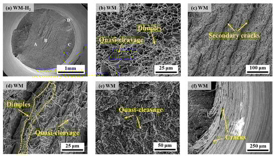 SEM diagrams of the fracture of the WM specimen in 10 MPa hydrogen: (a) overall low-power morphology; (b) position A; (c,d) position B; (e) position C; (f) position D.