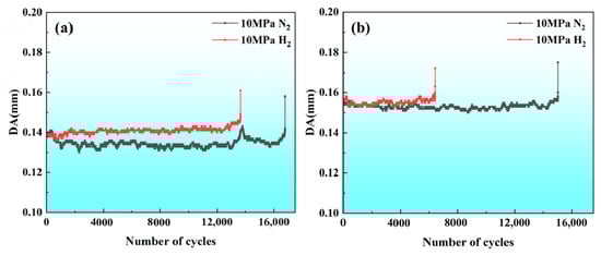 Displacement amplitude (DA) is the difference between the displacement obtained at the maximum stress and the minimum stress during a cycle of loading. The DA value remains stable, which means that the crack in the specimen is at the stage of germination; the point where the DA value starts to rise means that the crack is starting to germinate; and the DA value continuing to grow means that the crack is expanding []. Figure 13 shows the relationship between the number of failure cycles and DA for X70 pipeline steel BM and WM specimens in 10 MPa nitrogen and 10 MPa hydrogen environments. In the nitrogen environment (Figure 13a), the DA value of the BM specimen starts to rise after 1100 cycles, which is the point of crack initiation, and then it drops and then rises again. The DA value remains stable after that, and then it starts to rise again after 13,000 cycles, but starts to drop after 14,000 cycles until the specimen fracture occurs after 16,795 cycles, which suggests that the BM specimen under a nitrogen environment starts to crack at the early stage of the LCF, but it does not expand into a large crack. The DA value starts to decrease after the formation of a small crack, which consumes part of the energy. Under a hydrogen environment (Figure 13a), the point of crack initiation can be observed after 700 cycles, i.e., the hydrogen environment accelerates the formation of cracks, and the cracks have been in the initiation gestation period, while the DA value continues to increase until the specimen breaks after 12,000 cycles.
