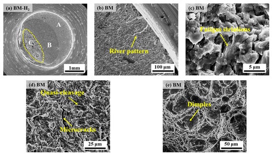 Fatigue fracture morphology of BM specimen in 10 MPa hydrogen: (a) overall low-power morphology; (b,c) position A; (d) position B; (e) position C.