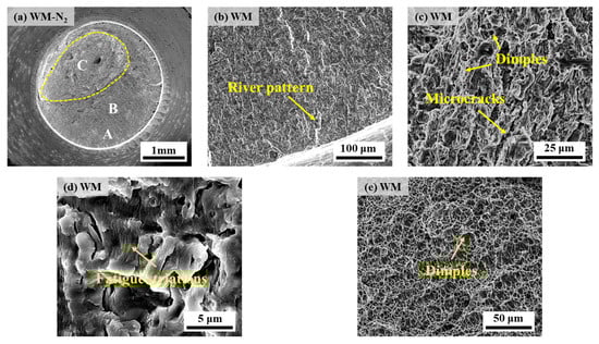 Fatigue fracture morphology of WM specimen in 10 MPa nitrogen: (a) overall low-power morphology; (b) position A; (c,d) position B; (e) position C.