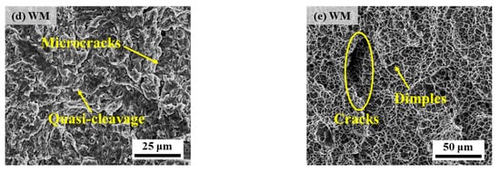 The scanning diagrams under a hydrogen environment are given in Figure 12. The fracture shows slight necking, and the shear lip on the fracture surface is not obvious, but the dimple morphology can still be observed (Figure 12b), in which the dimple size and number are small and few compared with that under a nitrogen environment. Many shallow secondary cracks can be seen near the fracture heart (Figure 12c), and the cracks can be seen clearly when zoomed in (Figure 12d). Magnifying the crack, the quasi-cleavage morphology can be seen, which is the distinct steps in the fracture surface due to rapid tearing, and a row of dimple morphology can be seen near the cracks (shown in the dashed box of Figure 12d); the quasi-cleavage morphology near the edge of the fracture (Figure 12e) is even more obvious; and the annular cracks can be observed on the surface of the specimen (Figure 12f). Therefore, except for the dimple morphology near the center, the WM as a whole showed quasi-cleavage fracture characteristics under a 10 MPa hydrogen environment and exhibited the fracture mode of quasi-cleavage fracture + ductile fracture.