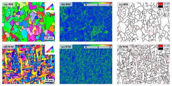 EBSD results of BM (a–c) and WM (d–f) specimens: (a,d) IPF diagrams; (b,e) KAM diagrams; (c,f) high and low angle grain boundaries diagrams.