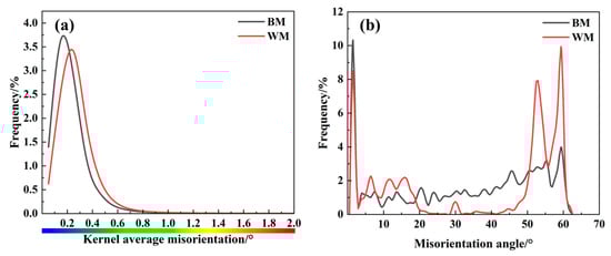 Statistical results of EBSD for BM and WM specimens: (a) KAM distribution curves; (b) grain boundary misorientation distribution.