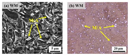 Microstructure of M/A constituents in the WM: (a) high-power SEM diagram of M/A constituents; (b) OM diagram of the M/A constituents corroded by Lepera reagent.