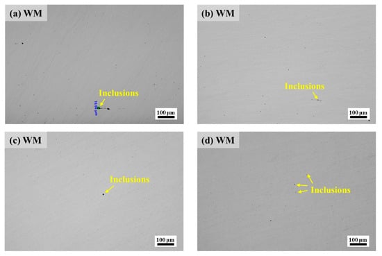 Inclusion rating on the steel surface of the WM specimen was carried out, and several fields of view were selected for observation, as shown in Figure 21. From the figure, it can be seen that the WM specimen surface was mainly detected as having Class B (alumina-like) inclusions and Class D (spherical oxide-like) inclusions, in which the width of alumina-like inclusions reached 16.66 μm (Figure 21a). To further determine the size and type of inclusions in the BM and WM specimen steels, an Aspex SEM was used to scan the non-metallic inclusions on an area of 92.160 mm2 of the test steel. Among them, a total of 613 non-metallic inclusions were detected in the BM sample steel (Figure 22a), with the inclusions mainly distributed in the 2–3 μm range, and the inclusions were mainly Oxide inclusions and CaS-Oxide-MnS inclusions, with a proportion of 57.0% and 25.3%, respectively; 1463 non-metallic inclusions were detected in the WM sample steel (Figure 22b), which is about 2.4 times larger than that of the BM. The size of inclusions was mainly distributed in the range of 2~4 μm, and the types of inclusions were CaS-Oxide-MnS inclusions, CaS-AlOxide-MnS inclusions, and CaS-MnS inclusions, the proportions of which were 32.5%, 31.4% and 21.1%, respectively.