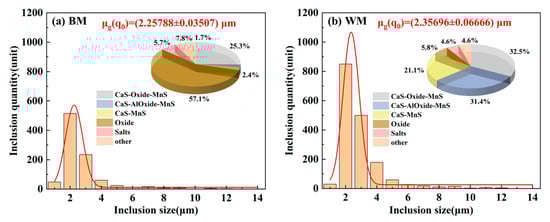 Distribution of number, size, and type of inclusions in BM and WM specimen steels: (a) BM; (b) WM.