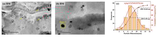 The second-phase precipitation behavior of the BM and WM specimen steels was investigated using the extraction replica method, as shown in Figure 23 and Figure 24. From Figure 23a, it can be seen that the precipitated phases of the BM specimen steel are diffusely distributed and most of the sizes are distributed in the 4–12 nm interval (Figure 23c), and the EDS energy spectra show (Figure 23d,e) that the types of precipitated phases are mainly the composite precipitation of (Ti, Nb, V)x(C, N)y. The high-resolution atomic diagram of the precipitated phase was characterized by high-resolution transmission electron microscopy (HRTEM) (Figure 23f), and the size of the precipitated phase was about 12.28 nm, with the Fourier Transform (FFT) and the Inverse Fourier Transform (IFFT) using the Digital Micrograph 3.5 software, which shows that the second-phase precipitation is mainly a face-centered cubic structure, and it was determined that the [011] interplanar spacing of the crystal face is around 0.258 nm. The TEM characterization of the WM specimen steel is shown in Figure 24, in which no nanoscale second-phase precipitation was detected.