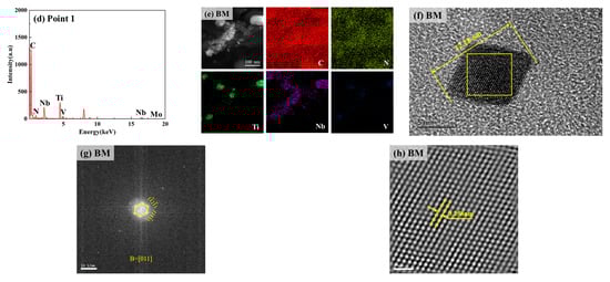 TEM characterization of steel extraction replica and EDS analysis in BM specimen: (a) low magnification of precipitated phase morphology; (b) high magnification of precipitated phase morphology; (c) particle size distribution of the precipitated phase; (d) point sweep of the EDS energy spectrum; (e) surface sweep of the EDS energy spectrum; (f) bright-field diagram; (g) FFT; (h) IFFT.