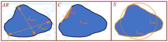 According to the calculation methods proposed by Yang et al. [36] and Altuhafi et al. [39], we can obtain the mathematical expressions of AR, C, and S, as shown in Equation (1).
