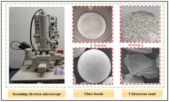 Calcareous sand, a widely distributed cohesionless geotechnical granular material in the South China Sea region, has gradually become an indispensable building material in island construction [44]. Unlike land-sourced quartz sand, calcareous-sand particles are a special kind of geotechnical medium formed by the deposition of marine organisms (shells and carcasses), which are characterized by high porosity, irregular shape, and angularity. Silica beads, the upper regular granular earth material counterpart to irregular calcareous sands, are also widely used in engineering and construction. Therefore, the test objects were silica beads and calcareous sand; the former was considered a regular round granular material, the latter was considered an irregular granular material, and the particle sizes were controlled within a single size grading interval. The Civil Engineering Experimental Center of China University of Mining and Technology-Beijing and the Key Laboratory of Environmental Rocks and Engineering Disaster Control of Jiangxi Province supported the development of basic physical–mechanical tests and shear tests for the two types of granular materials. The vertical loads were set to 100 kPa, 200 kPa, and 300 kPa, and the loading rate was held constant at 0.8 mm/min.