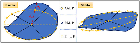 First, we need to obtain the elliptic function that is most similar to the granular material; by mapping the set of points on the two-dimensional plane, the points on the perimeter of the granular material can be mapped one by one to the smallest wrapped ellipse of the granular material via the elliptic wrapping method. Two typical types of particle shapes, narrow and stubby, are selected, and the elliptic wrapping method is utilized for the point mapping process. As shown in Figure 3, the Ctrl. P. is the point where the ellipse intersects with the particle, and P.M. P. and Ellip. P. are the points on the corresponding contours of the particle contour and the ellipse contour after discretizing the particle contour and the ellipse contour by the angular homogenization method by n parts, respectively (the value of n is taken to be 4 in the figure for the sake of visual presentation). The ratio of the connecting lines between the geometric center of the particles and the points on the two contours is used as a parameter for the degree of similarity between the two. The degree of similarity is affected by the lengths of the connecting lines, de and dp, and the more discrete the particles are when they are evenly divided, the more representative the similarity parameter is. The similarity parameter λ can be calculated via the magnitude relationship between de and dp, as shown in Equation (3).