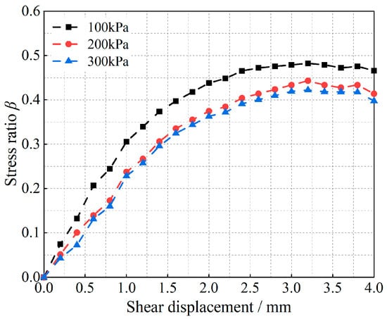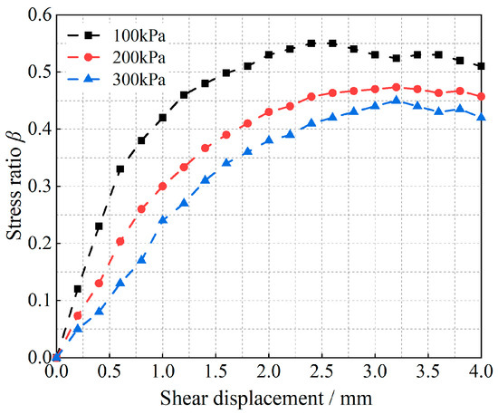 As shown in Figure 5 and Figure 6, the curves demonstrate the variation in the stress ratio with shear displacement for glass beads and calcareous sand under different vertical loads, and they can also be regarded as the curves of the variation in the particle shear strength with shear displacement, since the vertical load is kept constant with respect to the stress ratio. Figure 5 shows that the peak shear strength of the glass-bead particles at 100 kPa appears at a shear displacement of 2.5 mm, whereas the peak shear strengths of 200 kPa and 300 kPa appear at shear displacements of 3.2 mm. Additionally, shear vibration oscillations occur after shear damage occurs, and increasing the vertical load reduces the shear displacement required for damage to occur in the particle system. Moreover, observing the change in the slope of the curve in the figure reveals that the curve is almost linear before the shear displacement of 1.4 mm, i.e., the slope is almost unchanged; thereafter, the slope changes with the change in shear displacement, which indicates that the shear modulus of the granular material also changes. The curves of the variation in the shear-stress ratios of calcareous sand for the three vertical loading conditions in Figure 6 show the same increasing pattern, differing only in the magnitude of the increase in the curves and the shear displacements required for the occurrence of shear damage, owing to the differences in the types of materials.