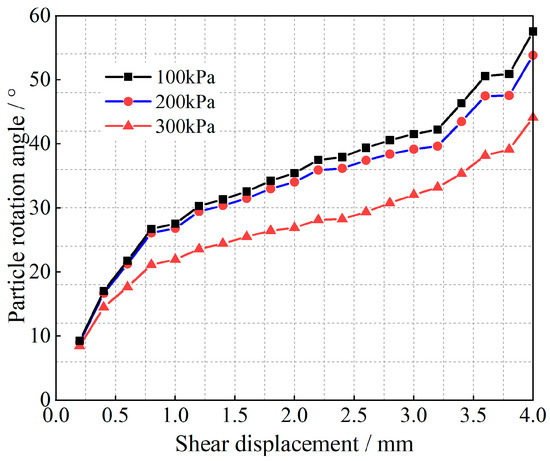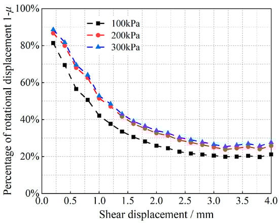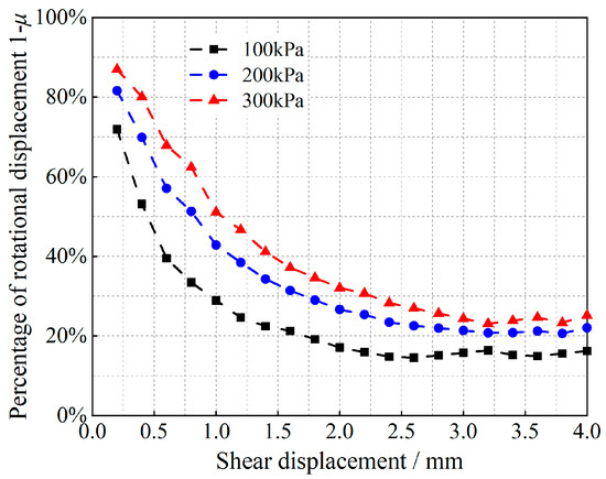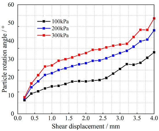 Equation (12) is a quadratic function of the ratio μ of the slip-induced shear displacement to the total shear displacement, and the corresponding (1 − μ) is the ratio of the shear displacement due to rotation to the total shear displacement. Tong et al. [35] obtained the angle of rotation of the particles; the results are shown in Figure 7, Figure 8, Figure 9 and Figure 10.