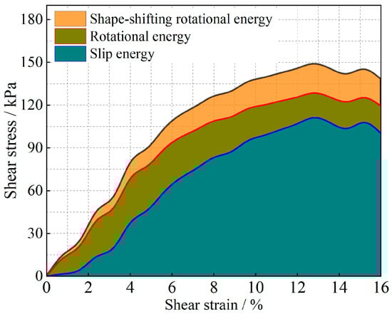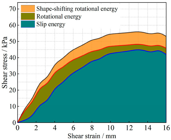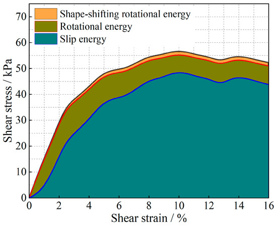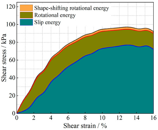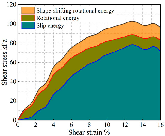 Owing to the above analysis, we consider that the energy change of soil particles in the shear process is caused completely by particle motion, and this energy change caused by particle motion is composed of two parts: sliding energy and rotational energy. To analyze the proportion of energy changes caused by different modes of motion in the whole process of damage to soil particles from the beginning of shear to the condition of shear, we carry out the analysis by using the stress-strain curves in the shear test and the energy equations in Equations (10)–(12). The results are shown in Figure 17 and Figure 18. The shape-induced energy change is a rotational energy that is provided by the conservation of energy maintained during the conversion of irregular particles to regular particles in particle rotation engineering. This means that the closer the particles are to a regular round shape, the closer the percentage of shape-induced energy change is to 0.