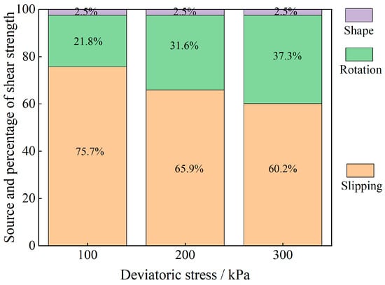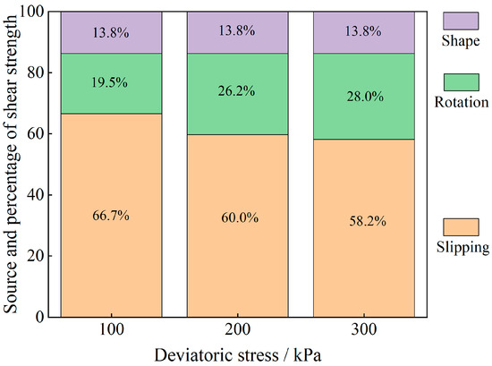 The energy evolution history of different materials under different bias stresses is obtained through stress-strain curves, and the sliding-induced energy and rotation-induced energy are calculated by using the scaling factor μ. Finally, on the basis of the law of energy conservation, the shape-induced energy within the change in rotational energy is obtained as a proportion of the rotational energy and is converted to a proportion of the total energy. Through the schematic diagram of the percentages of energy change caused by different factors in Figure 17 and Figure 18, we find that the shear strength of the granular material comes not only from overcoming the sliding friction resistance between particles but also from the rotational friction resistance, and the percentage of rotation-induced energy change in the calcareous-sand particles with a greater degree of irregularity of the soil particles is far greater than that in the regular silica beads, which is mainly because the irregular shape of the calcareous sand greatly affects the rotational properties of the particles. The main reason is that the shape of irregular calcareous sand greatly affects the rotational characteristics of the particles. As the deviatoric stress increases, the percentage of sliding-shear strength of the particles gradually decreases, whereas the percentage of rotational-shear strength increases. Moreover, the percentage of rotational-shear strength of calcareous-sand granular materials is significantly greater than that of glass beads because the irregularity of calcareous-sand granules requires more energy to be expended when rotation occurs, i.e., more shear strength is provided. This also suggests that if the effect of rotation on the shear properties of calcareous-sand materials is not considered and they are considered to experience sliding shear only, the shear strength of the material will be substantially overestimated.