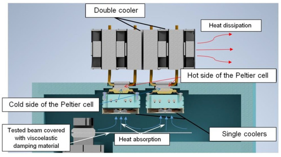 In order to determine the influence of temperature on the effectiveness of passive vibration isolation, an isothermal cooling chamber was designed and constructed for the purposes of this work. This made it possible to place the tested beam with damping material in a tight chamber, inside which the temperature could be controlled. The Peltier cells were used to cool the isothermal chamber (Figure 2). The cooling chamber included a thermoelectric heat exchanger, a two-channel temperature controller (control output, 230 V—AC power supply), a 500 W power supply (max. voltage 12 V, current 41.7 A), a temperature sensor and a housing made of RAVATHERM board XPS (extruded polystyrene foam [18]) (Ravago Building Solutions Poland Sp. z o.o., Warsaw, Poland). This material has good thermal insulation properties. The housing took the form of a chamber attached to the exciter.