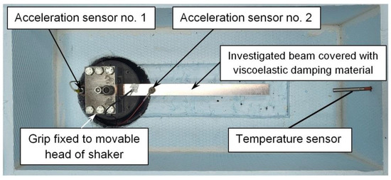 Piezoelectric vibration sensors were used to determine the accelerations of the head and the tested object [19]. Sensor no. 2 was used to determine the acceleration (A2) of the beam. Sensor no. 2 was mounted at a distance of 50 mm from the beam restraint. Vibration sensor no. 1 was used to measure the acceleration of the exciter head (A1). The uncertainty estimate of acceleration measurement using the Endevco 256HX-100 piezoelectric sensor (Endevco Europe, Fribourg, Switzerland) (for 95% confidence) is ±1.7% (for the frequency range from 20 Hz to 120 Hz); ±1.7% (120 Hz–2500 Hz and ±2.7% (2500 Hz–4000 Hz). To maintain repeatability of measurements, the beam (at the beginning of the tests) was tightened to the exciter head with a constant torque using a torque wrench. During subsequent tests at lower temperatures, both the beam and the acceleration sensors were not dismantled, which ensured constant measurement conditions. Figure 4 shows the cooling chamber attached to the shaker.