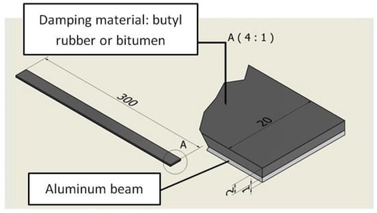 In the presented research, only the FLD configuration of the damping material was considered. The tested damping materials (butyl rubber and bitumen) with a self-adhesive layer were attached to the beam by pressing. In next step, the damping mats were rolled in order to obtain a high local pressure and in consequence a durable and strong connection. According to the manufacturers, mats made of butyl rubber and bituminous material do not contain toxic substances and are safe for humans (within the specified permissible operating temperatures). Mats used in passenger vehicles should also be flame retardant. The above-mentioned features are usually confirmed by appropriate certificates. The density of tested butyl rubber was 2 kg/dm3, while that of the bituminous material was 1.8 kg/dm3 [16]. The thickness of both damping materials (butyl rubber and bitumen) was 2 mm (Figure 5).