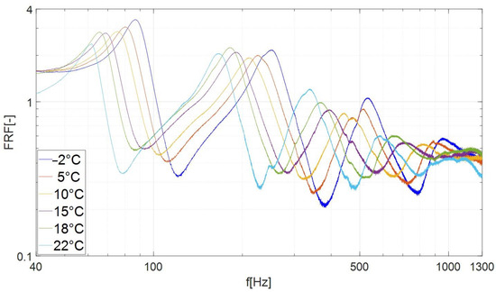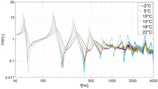 Figure 9 shows the FRF values of a beam damped with bituminous material. On the vertical axis of the obtained characteristics (Figure 9 and Figure 10), the frequency response function (FRF) was defined, which is used to determine the response of the system related to the magnitude of the excitation. The test results indicate that lowering the temperature causes a significant increase in the frequency of resonance vibrations and a slight change in amplitude. For frequencies higher than 1 kHz, the FRF values of individual curves became so similar that only modes 2, 3, 4 and 5 were subjected to further analysis (Figure 10).