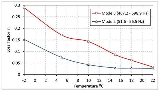 - In the range of low resonant frequencies (mode no. 2, 61.6 Hz–86.7 Hz), the loss factor values of bitumen oscillated around the value of 0.2. For the above-mentioned frequency range, the temperature does not significantly affect the damping properties of the bituminous material.