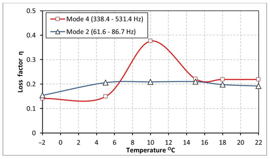 The graphs presented in Figure 11 indicate that the temperature (in the analyzed range from −2 °C to 22 °C) does not significantly affect the damping properties of the bituminous material for mode 2 (frequency range 61.6 Hz–86.7 Hz) where the loss factor values oscillates around 0.2. In the case of mode no. 4 (338.4 Hz–531.4 Hz), there is a high local increase in damping efficiency visible at 10 °C (η = 0.376).