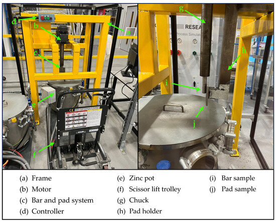 However, the corrosion behaviour of these materials was assessed under static conditions. The behaviour of materials under dynamic conditions could differ from that observed during static testing. In the dynamic situation, the pot hardware was exposed to chemical attacks from the liquid metal and dynamic wear due to the sliding of the bearing materials under load. It was demonstrated that the corrosion rates of materials in molten metal can differ from those observed in static baths [20]. Previous studies attempted to carry out dynamic tests on materials with potential use as pot-bearing materials in continuous galvanising [21,22]. However, a limited selection of materials has been tested under dynamic conditions; in addition to this, there is no evidence of dynamic tests conducted in Zn-Al-Mg baths in the literature.
