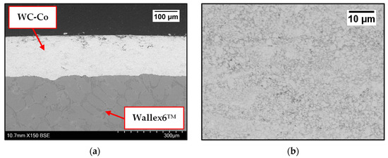 Cross-section of the as-received Wallex6TM bar coated with WC-Co (a); details of the WC-Co coating (b). Please note the different magnifications.