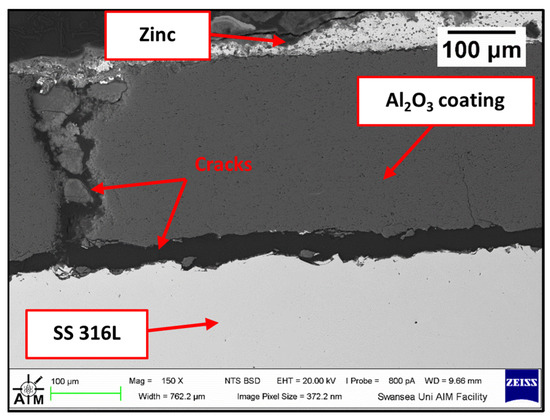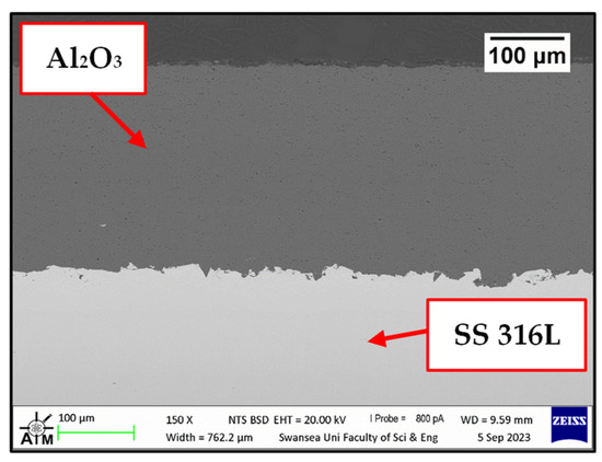 SEM image of the cross-section of high-velocity oxygen fuel (HVOF) Al2O3 coated onto the surface of stainless steel (SS) 316 L.