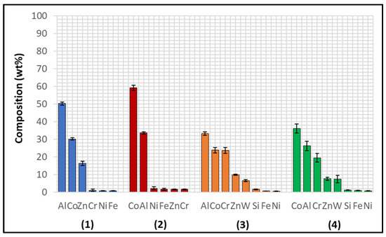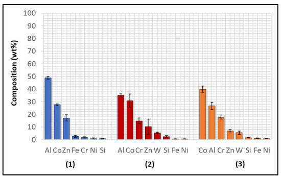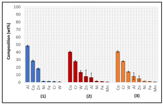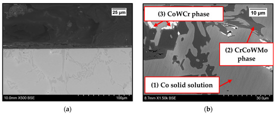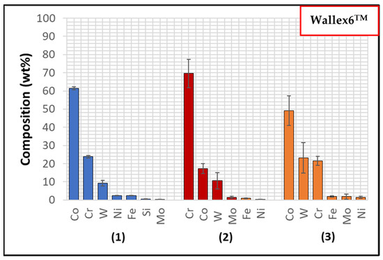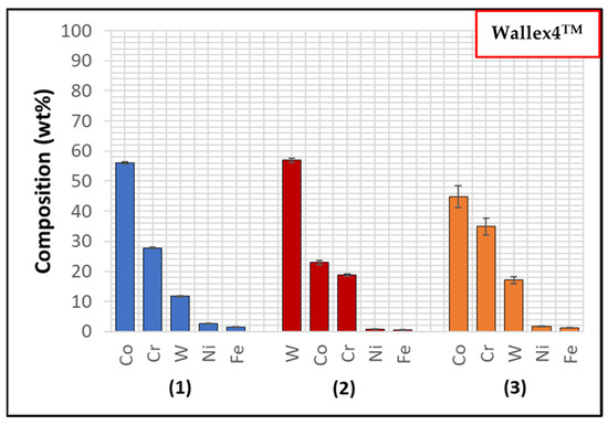 Wallex6TM is the equivalent of Stellite 6 and is characterised by a Co solid solution matrix phase (1), with Co, Cr, and W as the main constituents. EDS found that the average element composition of this phase was Co (61.3 ± 0.8 wt.%), Cr (23.8 ± 0.6 wt.%), and W (9.3 ± 1.5 wt.%), as shown in Figure 6. Two eutectic phases were observed in the Co matrix phase: a primary CrCoWMo (2) phase and a secondary eutectic phase of CoWCr (3) (Figure 4b). The results of EDS elemental analysis showed that the primary eutectic phase was composed of Cr (69.6 ± 7.8 wt.%), Co (17.3 ± 2.8 wt.%), W (10.6 ± 4.6 wt.%), and Mo (1.4 ± Mo wt.%), with traces of Fe and Ni. The secondary phase mainly contained Co (49.2 ± 8.1 wt.%), W (23.2 ± 8.4 wt.%) and Cr (21.6 ± 2.5 wt.%).