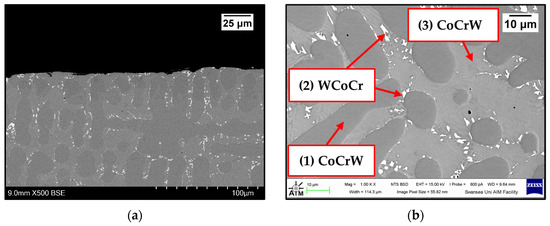 The composition of Wallex4TM is similar to that of Wallex6TM. The SEM image showed the presence of three different phases (Figure 5b). EDS analysis was conducted to determine the composition of these phases, as shown in Figure 7. EDS revealed the presence of a dark grey phase (1), that is a solid solution matrix phase containing Co (56.1 ± 0.4 wt.%), Cr (27.8 ± 0.2 wt.%), W (11.8 ± 0.2 wt.%), Ni (2.7 ± 0.2 wt.%), and Fe (1.6 ± 0.1 wt.%). In addition to this, two eutectic phases were present. The bright phase (2) was made of W (57.0 ± 0.7 wt.%), Co (23.0 ± 0.7 wt.%), Cr (18.8 ± 0.2 wt.%), Ni (0.8 ± 0.0 wt.%), and Fe (1.3 ± 0.1 wt.%), whereas the light grey phase (3) contained Co (44.9 ± 3.6 wt.%), Cr (34.9 ± 2.7 wt.%), W (17.1 ± 1.1 wt.%), Ni (1.8 ± 0.1 wt.%), and Fe (1.3 ± 0.1 wt.%). It was observed that the bright eutectic phase had a greater portion of W compared to the Co-rich matrix; in addition to this, the composition of the dark grey phase was similar to that of the matrix, with greater Cr and W content. The composition does not significantly differ from Wallex6TM, as shown in Table 2; however, Wallex4TM was found to have lower Co content (47.2 wt.%) and higher W additions (14.3 wt.%) compared to Wallex6TM, which contained Co (59.1 wt.%) and W (3.8 wt.%).