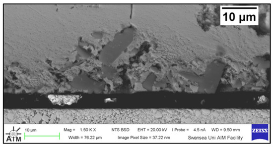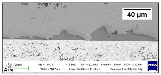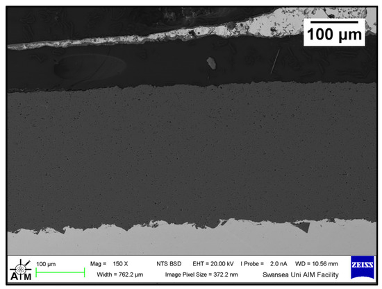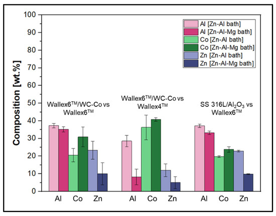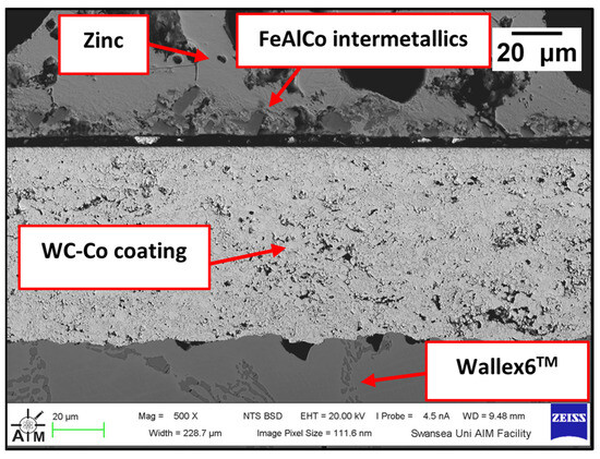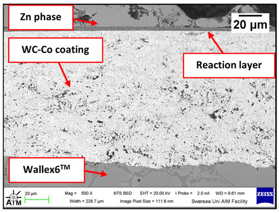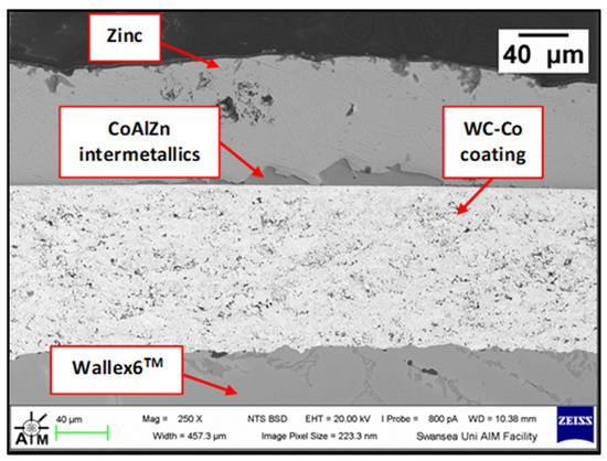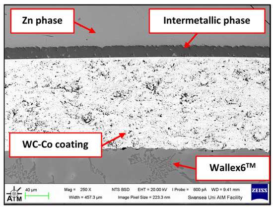 Figure 8 shows a cross-section of the WC-Co/Wallex6TM bar after 48 h of testing in Zn-Al. The SEM image showed that the coating was not prone to damage after contact with the static pad specimen. Cracks, as well as pores, can provide pathways for liquid Zn alloy to penetrate the coating and corrode the base metal [16]. However, no reaction products accumulated below the coating, highlighting that Zn did not diffuse into the base metal. The integrity of the coating upon sliding with the Wallex6TM counterpart was linked with the hardness of the material. WC is harder than Wallex6TM; it is known that the hardness of spherical WC lies between 2100–2500 HV, which is significantly higher than the hardness of Wallex6TM (400 HV) and Wallex4TM (570 HV) [25], suggesting that the WallexTM pads could not inflict severe wear damage to the bar specimens.