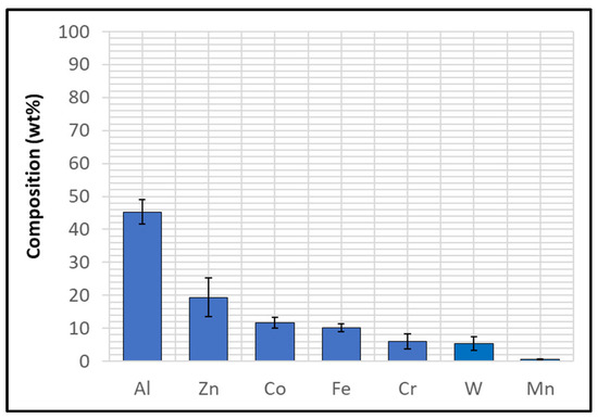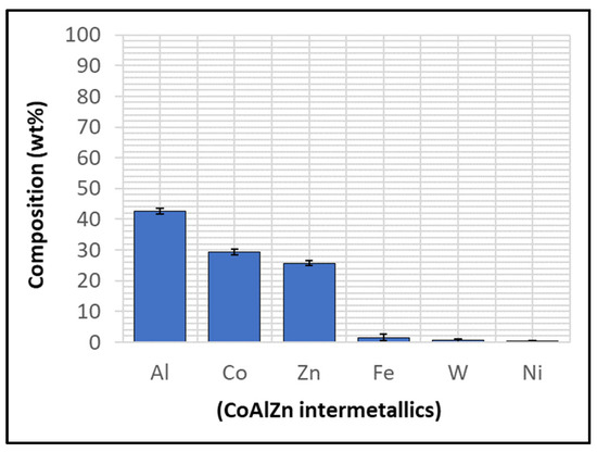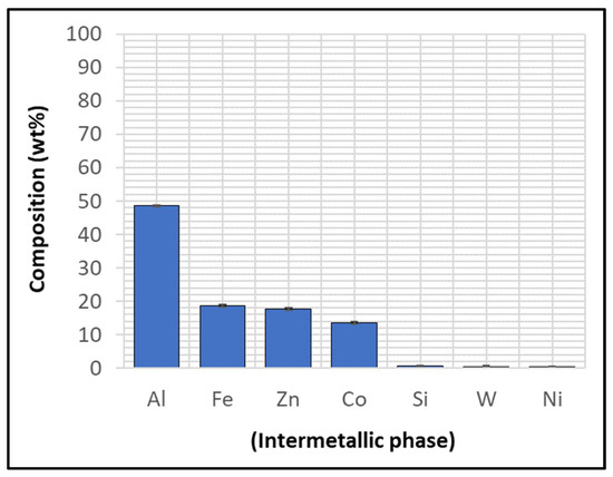 Although the WC-Co coating protected Wallex6TM from the attack of liquid Zn-Al, the analysis of the cross-section revealed that intermetallic compounds formed on the contact surface, as illustrated in the high magnification image (Figure 9). These compounds were absent in the as-received specimen (Figure 2a). The results of the EDS phase elemental analysis conducted in this region (Figure 10) showed that the intermetallic compounds are Zn-based phases, which also contain Al (42.6 ± 0.9 wt.%) and Co (29.3 ± 0.9 wt.%), with traces of Fe, W, and Ni. Previous studies reported the presence of intermetallic phases on the surface of WC-Co coatings [26,27].