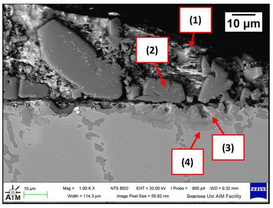 A reaction layer developed beneath the surface of the sample that was found to mainly contain Al-Zn-Co-Fe-Cr-W. Similar findings were obtained by Zhang [29] who reported the formation of a layer of cobalt-based aluminides of Al-Co-Zn-Cr-Fe-W on the contact surface of a Stellite 6 bearing after exposure to GI. In this study, the reaction layer was interrupted by the CoCrWMo eutectic phases present in the alloy, meaning that the diffusion layer did not form at locations where the eutectic phases were present. In Figure 11, (3) and (4), respectively, denote the region within the subsurface reaction layer and the interface between the reaction layer and the bulk of the alloy. It was observed that Al was present in the reaction layer, whereas the Co content diminished (20.6 ± 3.8 wt.%) compared to the unreacted Co-solid solution phase, as shown in Figure 6 (56.1 ± 0.4 wt.%). The Co content was found to increase (37.7 ± 2.4 wt.%) in the vicinity of the interface with the Co-solid solution phase, indicating that Co was depleted from the reaction layer below the surface.