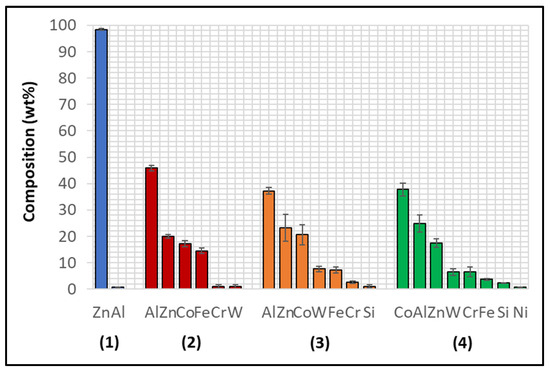 A similar corrosion behaviour was observed in the samples immersed in Zn-Al-Mg. Figure 24 illustrates that reaction products developed onto the WC-Co coating (1), which were found to mainly contain Al (45.3 ± 3.7 wt.%), Zn (19.4 ± 5.8 wt.%), Co (11.7 ± 1.7 wt.%) and Fe (10.3 ± 1.2 wt.%), as shown in Figure 25. The reaction products of this specimen formed a distinct layer, and their presence confirms that the Co matrix of the thermal sprayed coating reacts with the elements present in the bath. No reaction with Mg was detected, as observed in the benchmark configuration.