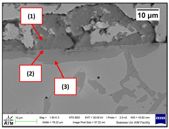 The Wallex6TM pad was found to react with the molten metal bath, after exposure to Zn-Al. Cross-sections of the specimens were analysed in the unworn region (Figure 11) and they were compared to the as-received specimen (Figure 4). EDS point spectrum analysis was performed to reveal the composition of the phases observed in this area (Figure 12). The results clearly showed the presence of dross phases (2) within the top Zn phase (1) and on top of the surface in contact with molten Zn-Al. These Zn-based intermetallic compounds were found to mainly contain Al (45.9 ± 1.0 wt.%), Co (17.1 ± 1.2 wt.%), Fe (14.5 ± 1.0 wt.%) and small amounts of Cr and W. Co has a strong affinity for Al and there is evidence that the Co solid solution phase of Co-Cr-W alloys reacts with the Al contained in liquid Zn baths [30]. The products of this reaction are CoAl particles forming on the sample surface. The information obtained in the present study showed that Fe was contained in the CoAl intermetallic compounds after testing in Zn-Al. This finding aligns with previous studies, which reported that CoAl particles transformed to FeAl complexes, as the exposure to liquid Zn alloy increased because of the presence of dissolved Fe in the Zn alloy [26,28].