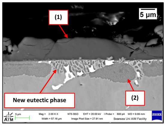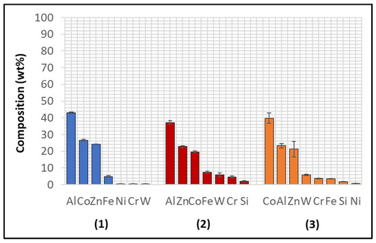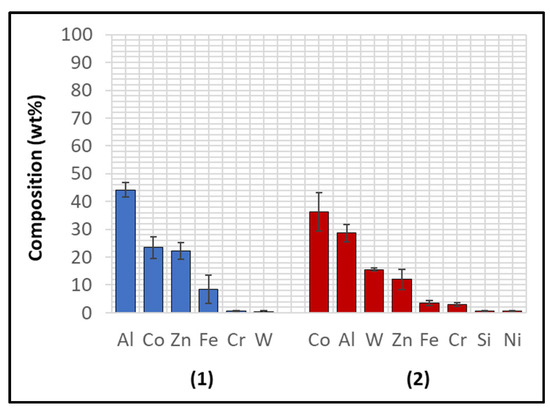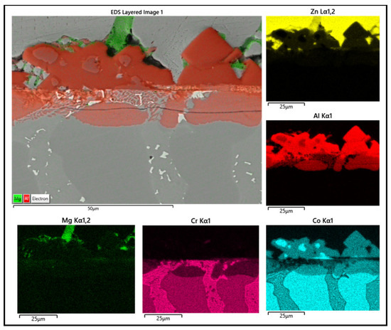 The Wallex6TM pad was corroded in a similar fashion to the specimen immersed in Zn-Al (Figure 17). CoAlZn intermetallic compounds grew on the surface of the material (1) and a diffusion layer formed beneath the surface of the sample (2). The results of the EDS analysis (Figure 18) showed that this reaction layer contained Al (35.1 ± 1.5 wt.%) and Co (30.9 ± 5.3 wt.%), whereas, outside this layer, the composition changed to Co (39.9 ± 2.4 wt.%) and Al (26.6 ± 2.9 wt.%), indicating Co depletion from the reaction layer, as observed after exposure to the Zn-Al bath, confirming that the introduction of Mg into the bath did not alter the corrosion behaviour of the materials present in the current configuration.