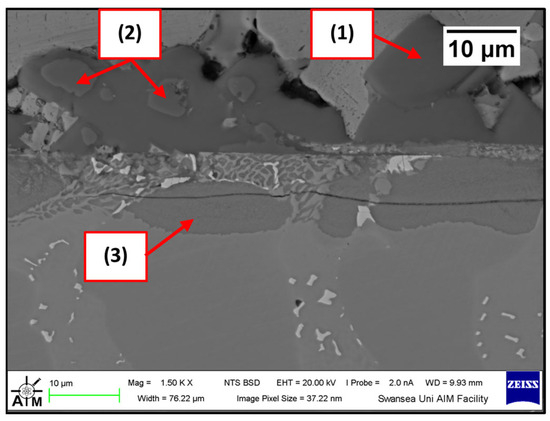 SEM image of the Wallex4TM pad after dynamic testing in Zn-Al-Mg: (1) intermetallic particles, (2) possible wear debris, (3) diffusion layer.