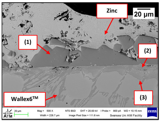 Cross-section of the Wallex6TM pad specimen after exposure to Zn-Al-Mg: (1) intermetallic particles, (2,3) diffusion layer.