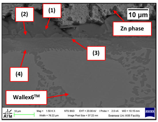 Several corrosion products were identified on the Wallex4TM pad specimen (Figure 21), and the composition of the new phases was investigated (Figure 22). Intermetallic dross phases were found on the surface of the alloy (1), which contained Al (44.2 ± 2.6 wt.%), Co (23.4 ± 4.0 wt.%), Zn (22.3 ± 3.1 wt.%), and Fe (3.4 ± 1.0 wt.%). The results of EDS showed that the composition of the dross was similar to that of the intermetallic particles found on the bar specimen (Figure 19), although it contained 9.9 wt.% more Co and 15.2 wt.% less Fe. A subsurface reaction layer was still present (2), where both Al and Zn were detected, and the Zn content was lower compared to the dross phase. The Co and Cr content measured in this layer was found to be lower compared to the as-received specimen (Figure 7). The results of EDS analysis showed that the reaction layer contained Co (36.3 ± 7.0 wt.%) and Cr (2.9 ± 0.7 wt.%), whereas the solid solution phase of the as-received specimen contained Co (56.1 ± 0.4 wt.%) and Cr (27.8 ± 0.2 wt.%). Therefore, the analysis suggested that the depletion of these elements from the reaction layer occurred. Moreover, it was observed that the CoCrW eutectic phase present in Wallex4TM (Figure 5b) reacted with the molten metal bath as highlighted in the EDS maps (Figure 23), which show evidence of Al diffusion from the bath.