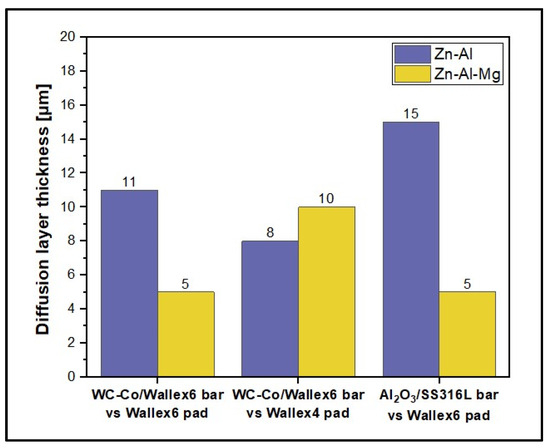 - Changing the bath chemistry from Zn-Al to Zn-Al-Mg reduced the diffusion of Zn into Wallex6TM and Wallex4TM by approximately 60%, leading to less wear damage.
