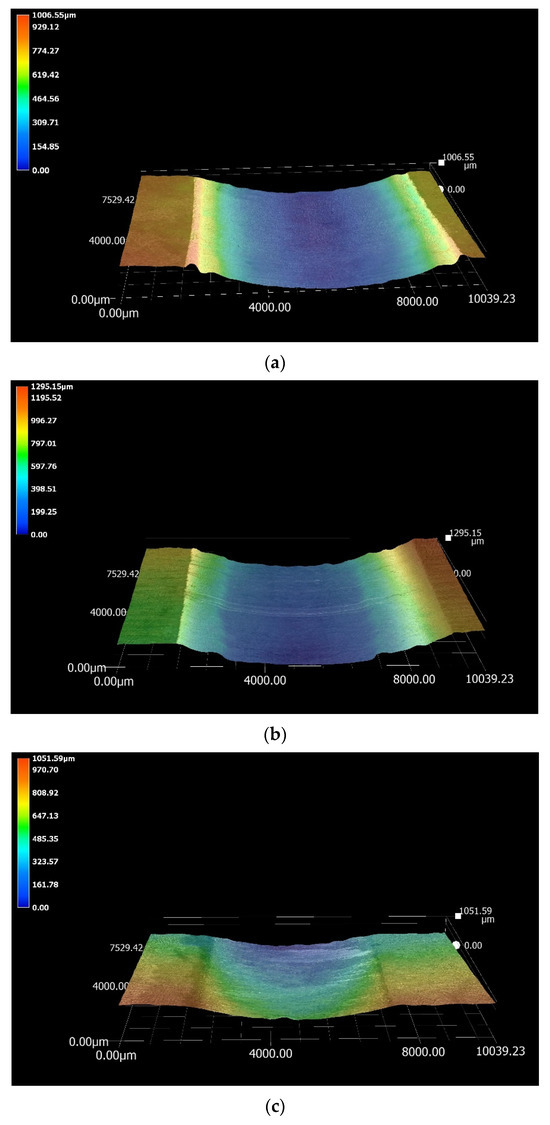 Three-dimensional (3D) imaging of the wear scars produced on the pad specimens tested in Zn-Al-Mg: (a) Wallex6TM after sliding with Wallex6TM/WC-Co; (b) Wallex4TM after sliding with Wallex6TM/WC-Co; (c) Wallex6TM after sliding with SS 316L/Al2O3. The scars are more superficial compared to those formed in the Zn-Al bath.