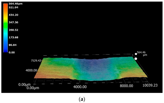 where ‘A’ is the measured cross-sectional area of the wear scar and ‘L’ is the length of the specimen. The worn track section ‘A’ was determined using the digital microscope. The total sliding distance ‘S’ was obtained by multiplying the sliding speed ‘v’ in [m/min] and the duration of sliding ‘t’ in [min] (Equation (2)):