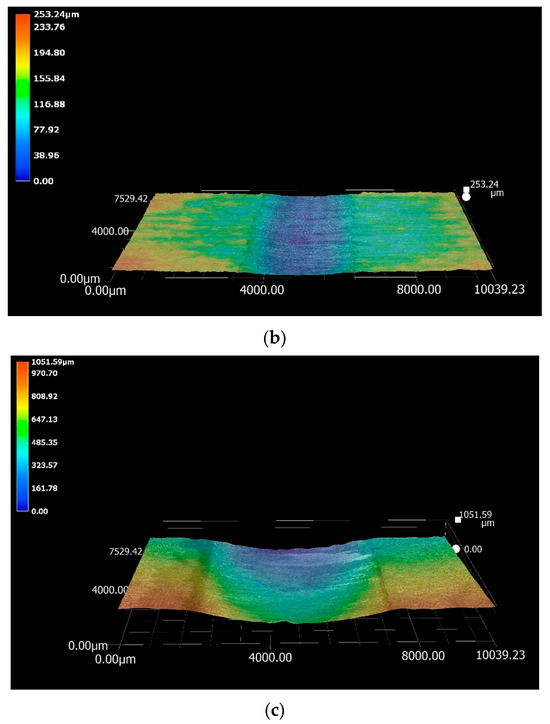 Three-dimensional (3D) imaging of the wear scars produced on the specimens tested in Zn-Al: (a) Wallex6TM after sliding with Wallex6TM/WC-Co; (b) Wallex4TM after sliding with Wallex6TM/WC-Co; (c) Wallex6TM after sliding with SS 316L/Al2O3. Deep scars formed after contact with the WC-Co-coated bars, whereas a more superficial scar formed after contact with the Al2O3-coated bar specimen.